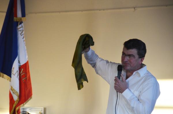 Les applaudissements eurent à peine le temps de diminuer, que déjà, nous dûmes accueillir une nouvelle surprise, quand Olivier Safon, bouleversé lui-même, car pris au dépourvu, brandit un morceau de tissu, que venait de lui remettre Aline Agnel, fille de résistant, qui à travers ses souvenirs personnels et familiaux contribua par ses témoignages à la rédaction de certains passages de l’ouvrage : « Nous étions en résistance ».