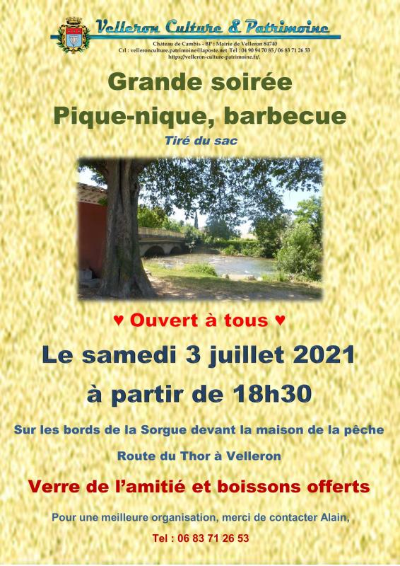 Velleron Culture et Patrimoine vous invite à son grand pique-nique en bords de Sorgue samedi 3 juillet à partir de 18H30.