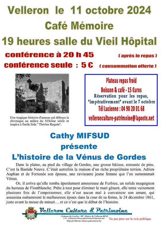 Tragique histoire d’amour au XIXème siècle à Gordes, qui inspira Emile Zola pour son roman « Thérèse Raquin ». Conférence par Mme Cathy Mifsud, vendredi 11 octobre 2024, salle du Vieil Hôpital à Velleron, à partir de 20h45.