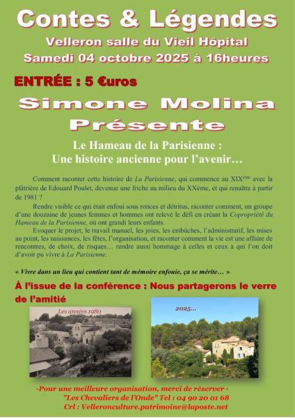 Samedi 4 octobre 2025, Velleron Culture & patrimoine et Les chevaliers de l’Onde vous proposent une conférence présentée par Mme Simone Molina : « Le Hameau de la Parisienne », autour de la sauvegarde d’un site historique et sa reconversion en un lieu de vie solidaire, tourné vers le présent et un avenir responsable.