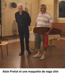 Pour clore la conférence, Jean a donné la parole à un invité d’honneur, un véritable passionné : Alain Pretot le fabricant de nego chin bien connu des L’Islois, qui a expliqué les spécificités de ce bateau dont on ne connaît pas l’époque de son apparition. D’une longueur de 5 mètres, léger, à fond plat, il doit glisser silencieusement sur l’eau pour ne pas effrayer le poisson. Son appellation singulière (littéralement : noie chien) qui fait référence au caractère peu stable de l’embarcation, viendrait sans doute d’un mot employé sur les chantiers navals