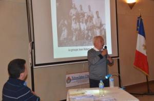La nouvelle disposition de la salle permit aux nombreux auditeurs venus se joindre aux invités, après le repas, de suivre de façon confortable le diaporama très fourni d’images et de témoignages de l’époque, élaboré conjointement par le conférencier et les membres de Velleron Culture et Patrimoine. Monsieur Orinier nous fit l’honneur de le commenter avec Olivier Safon.