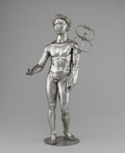 que nous allions découvrir une collection exceptionnelle provenant de la Bibliothèque Nationale de France, dont l’un des plus fameux trésors d’argenterie de l’Antiquité gallo-romaine : le célèbre trésor de Berthouville, découvert en 1830 par un paysan normand (Prosper Taurin) qui labourait son champ. Il comptait, comme cela se faisait à l’époque, faire fondre ces trouvailles, mais un notable de sa ville lui conseilla de les montrer à des experts, ce qui pourrait lui apporter bien plus d’argent….