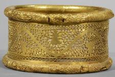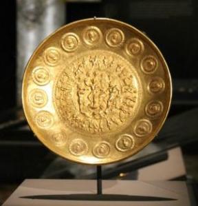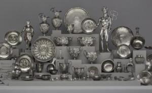 Pour illustrer le faste dans l’Antiquité, l’exposition présente d’autres pièces issues d’autres trésors comme des magnifiques plats travaillés au repoussé. Le plat d’Achille, dit « bouclier de Scipion », en argent, mesure 71 cm de diamètre et pèse plus de dix kilos. Il illustre un passage de l’Illiade – la colère d’Achille – et aurait été trouvé vers Avignon au XVIIème siècle par des pêcheurs, puis acheté par Louis XIV, lui épargnant ainsi le chemin de la fonte.