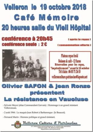 Velleron Culture & Patrimoine vous propose un nouveau Café Mémoire : « La Résistance en Vaucluse », avec un hommage à M. Sylvain Meyer, résistant velleronnais, l’évocation du maquis Jean Robert à Barbarenque et enfin celle de Fernand Marin, homme politique et résistant. Conférence présentée par MM. Olivier Safon et Jean Ronze, vendredi 19 octobre 2018 à partir de 20 heures, salle du Vieil Hôpital, Velleron.